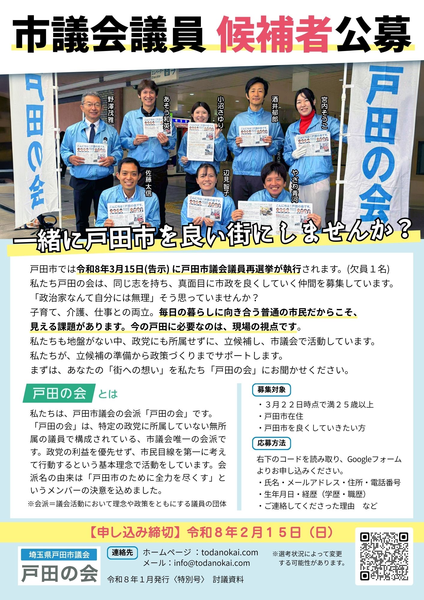 私たち戸田の会は、同じ志を持ち、真面目に市政を良くしていく仲間を募集しています。
